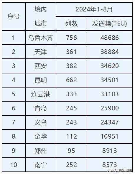 2024年1-8月,西安市首发发出的中欧专列达382列,发送集装箱34620个,居全国第三。