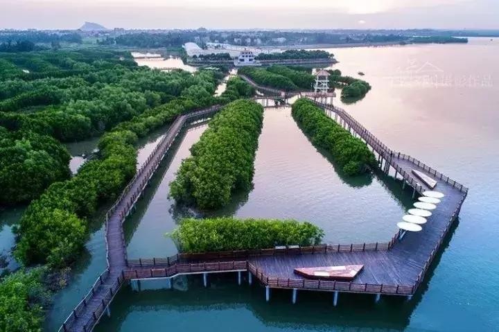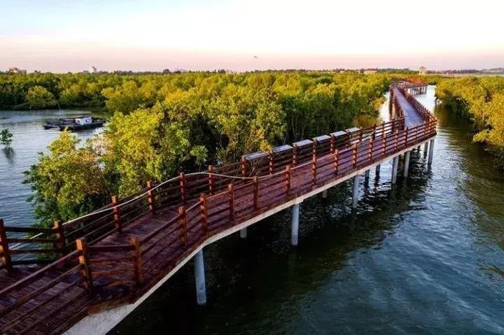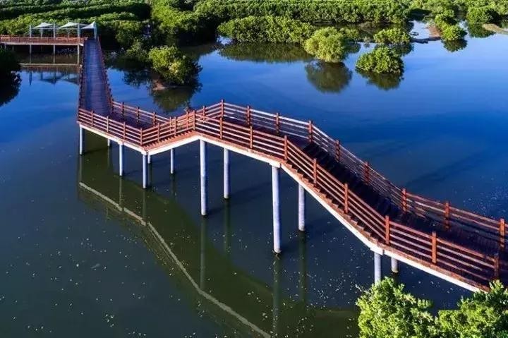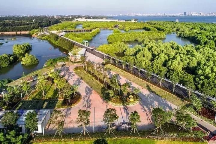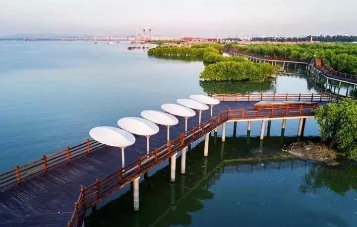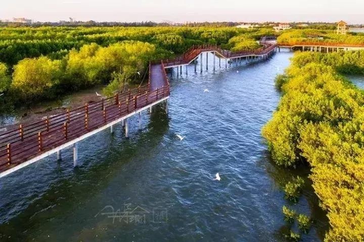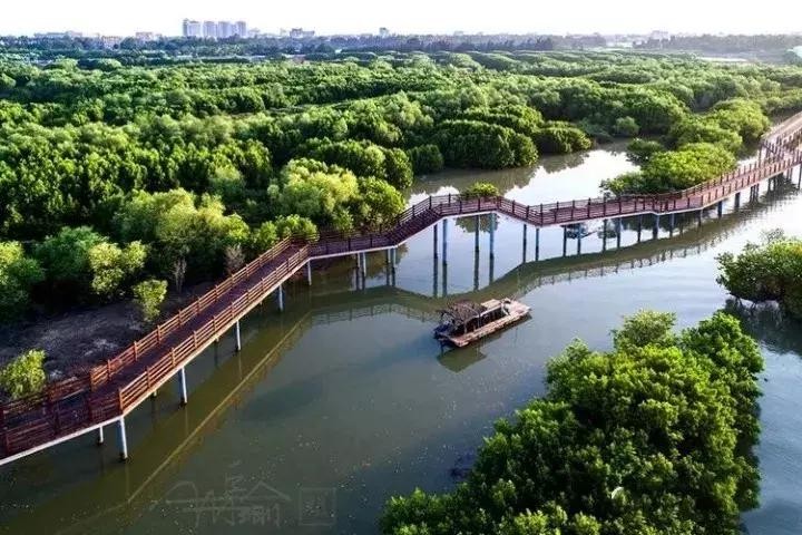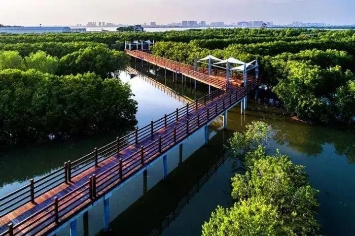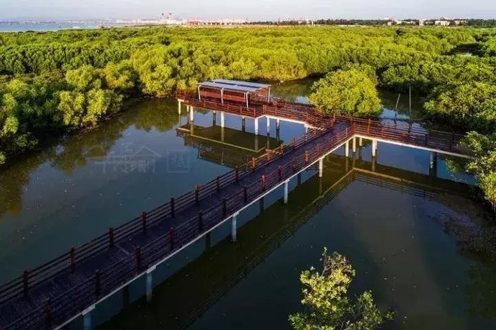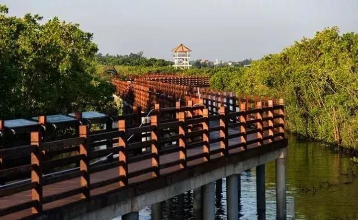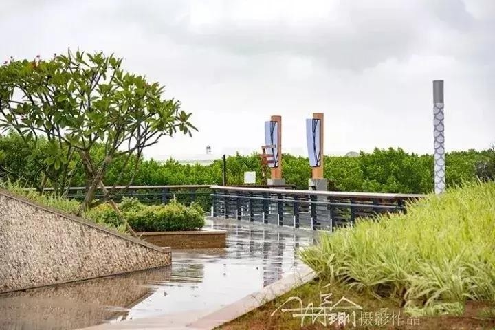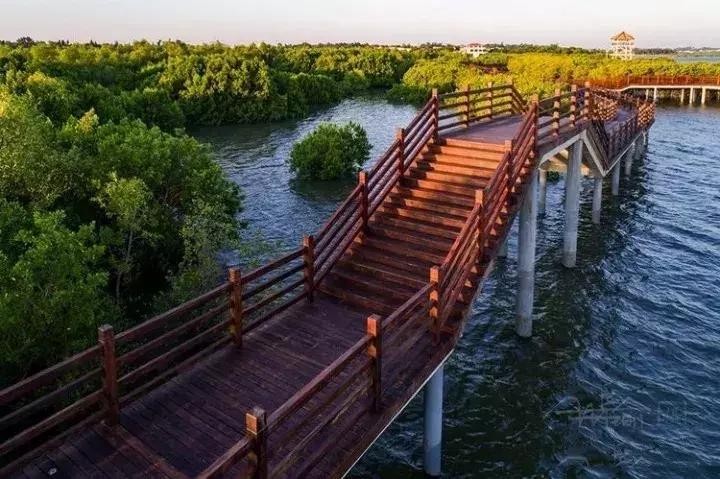 公园建设以一个环形的滨海栈道为游览主线,栈道时而穿梭在水网密布的红树林里。