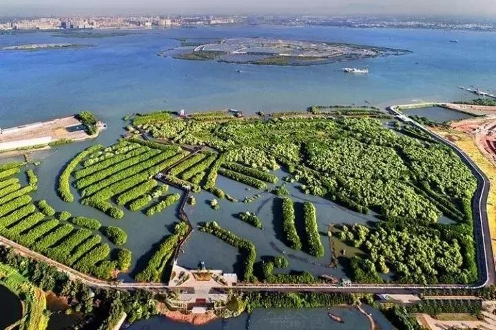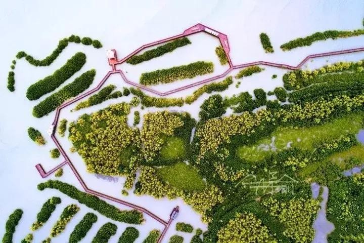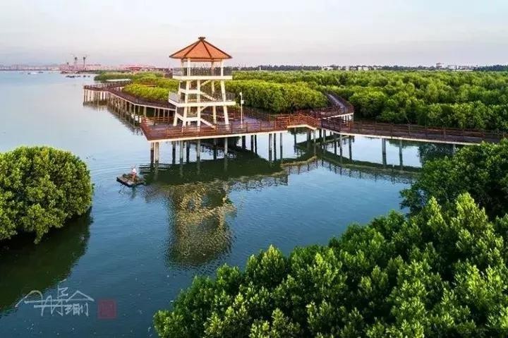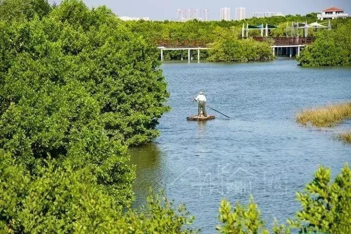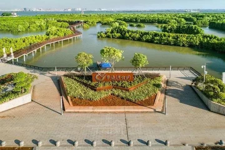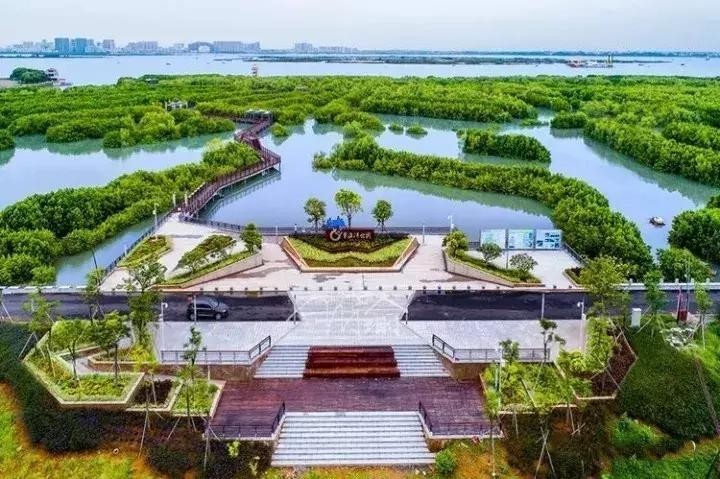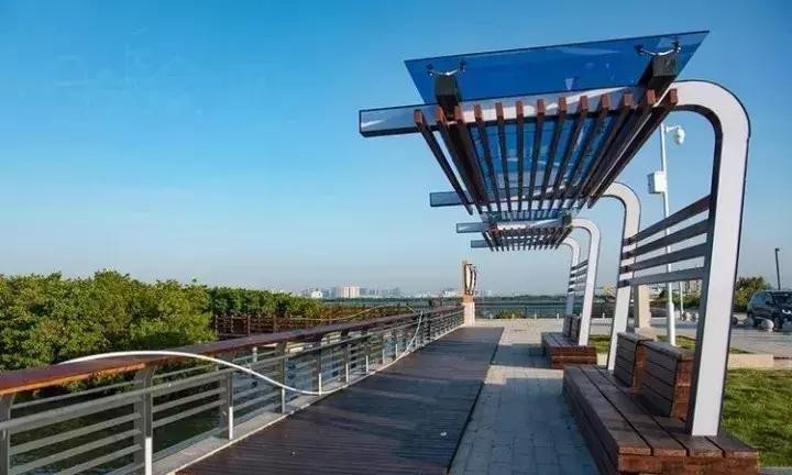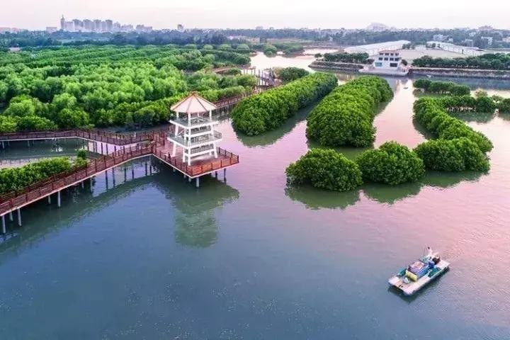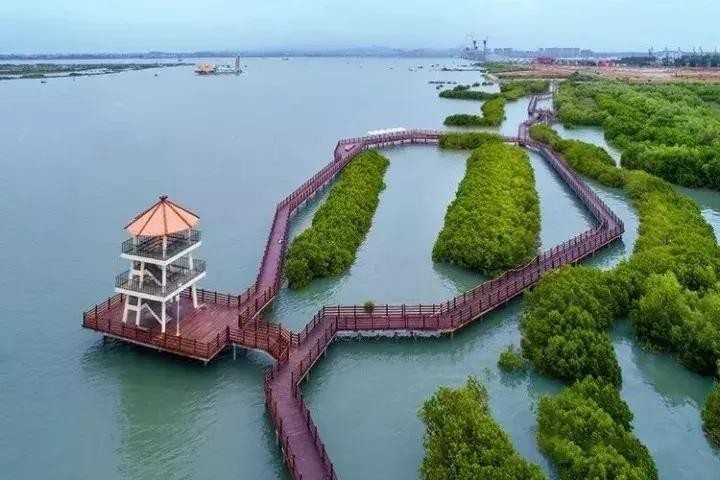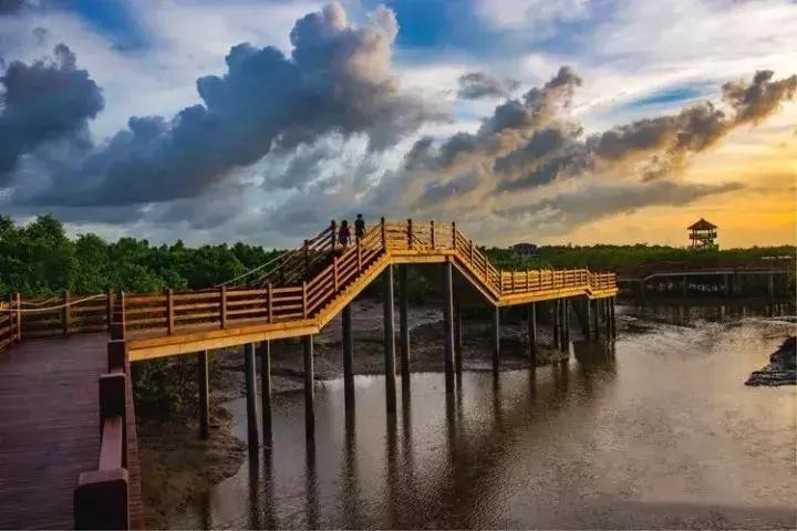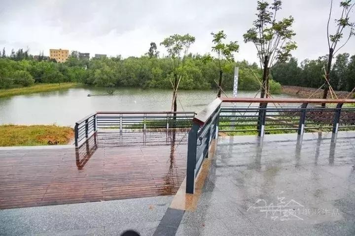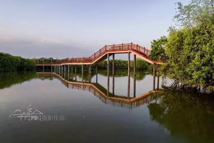 公园建设以一个环形的滨海栈道为游览主线,栈道时而穿梭在水网密布的红树林里。