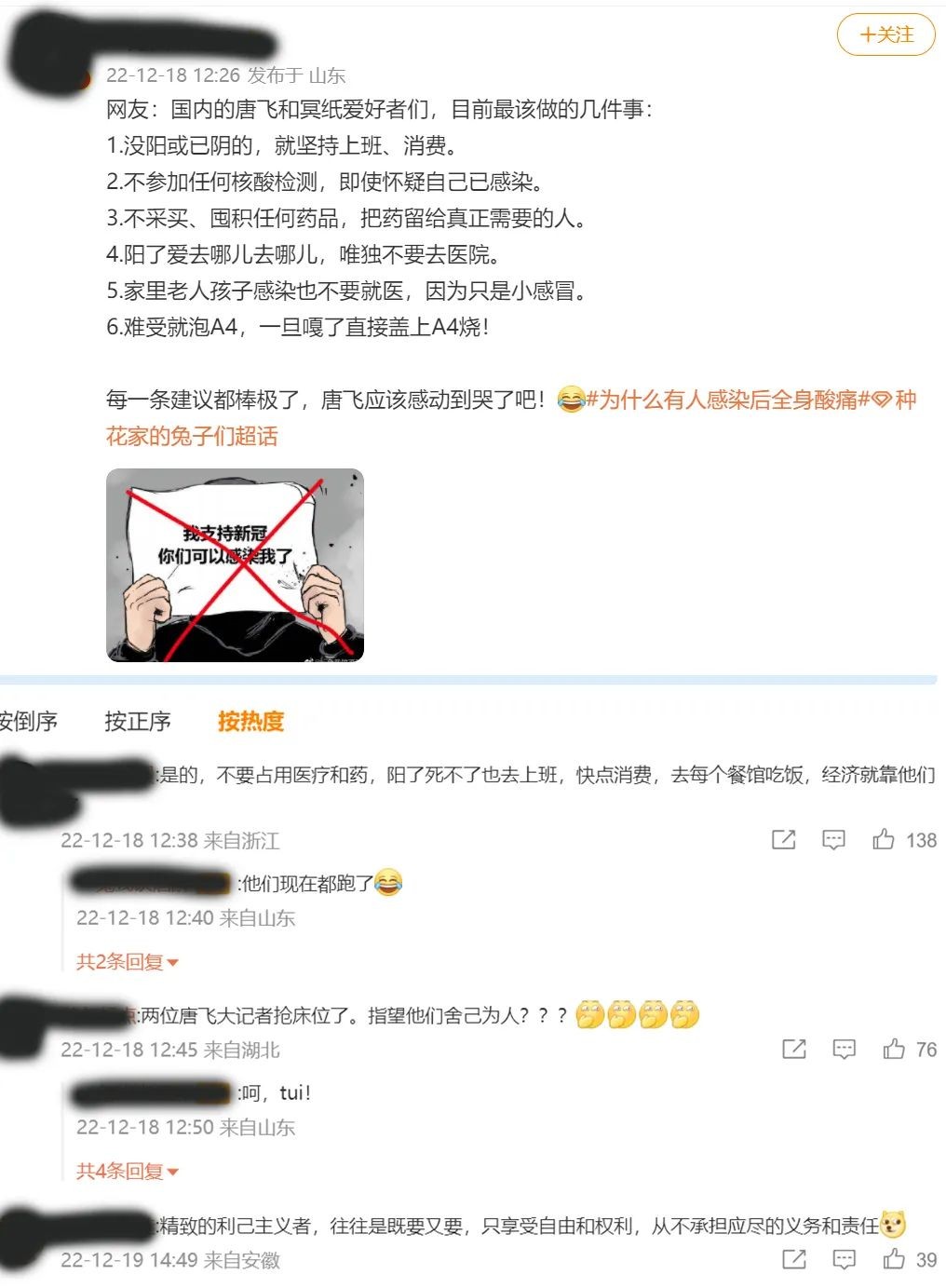 虽然疫情期间压抑的环境让人窒息,人们迫切希望回到正常的生活,这无可厚非,相当一部分人把自己的不满宣泄在网络上,这也是“唐飞党”形成的根源,后面又出了一些新词,如“唐飞撞门”(唐飞们撞开了我国对于新冠病毒严防死守的大门),“唐飞A4”(唐飞和冥纸爱好者),他们都对我国动态清零到全面开放做出了不可磨灭的“贡献”。