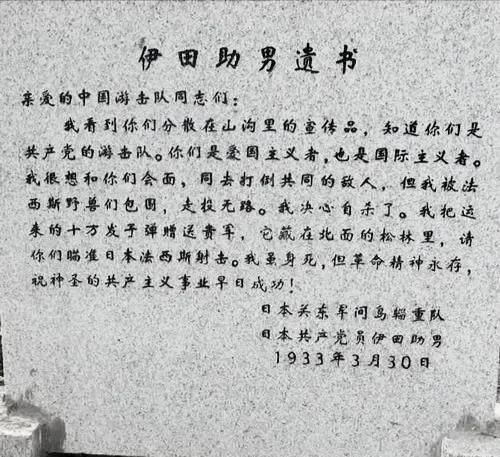 同年5月,在吉林省汪清县,也就是伊田助男最后停留的地方,一座简朴的纪念碑被竖立起来。碑文简要叙述了伊田助男的事迹,称赞他是"国际主义战士"和"中日人民友谊的象征"。这座纪念碑成为了当地一个重要的革命教育基地,每年都有众多学生和群众前来参观。
