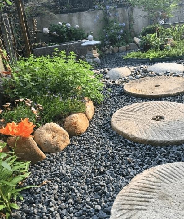 屋主买了一些旧石盘铺设小径,然后用鹅卵石作装饰。