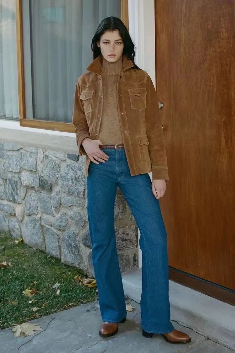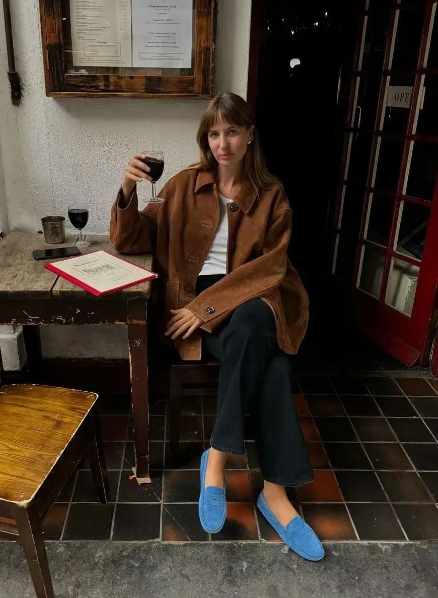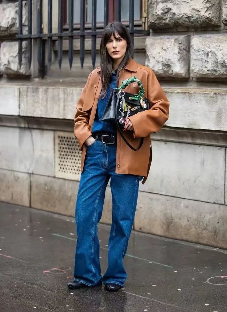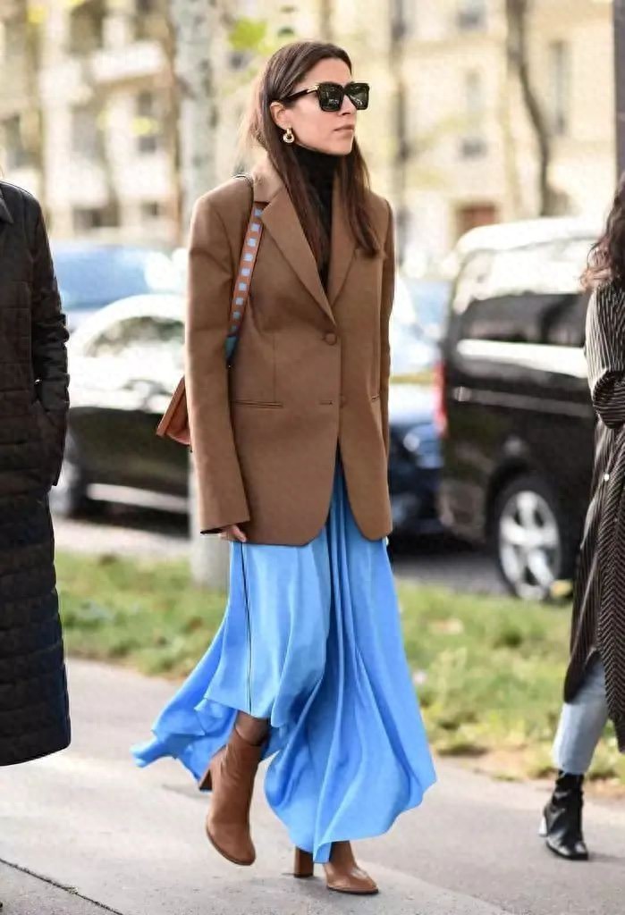 棕色西装外套或者皮夹克,也可以内搭一身不同色调的蓝色衣物,复古时髦,洋溢着丝丝暖意,很有秋冬氛围。