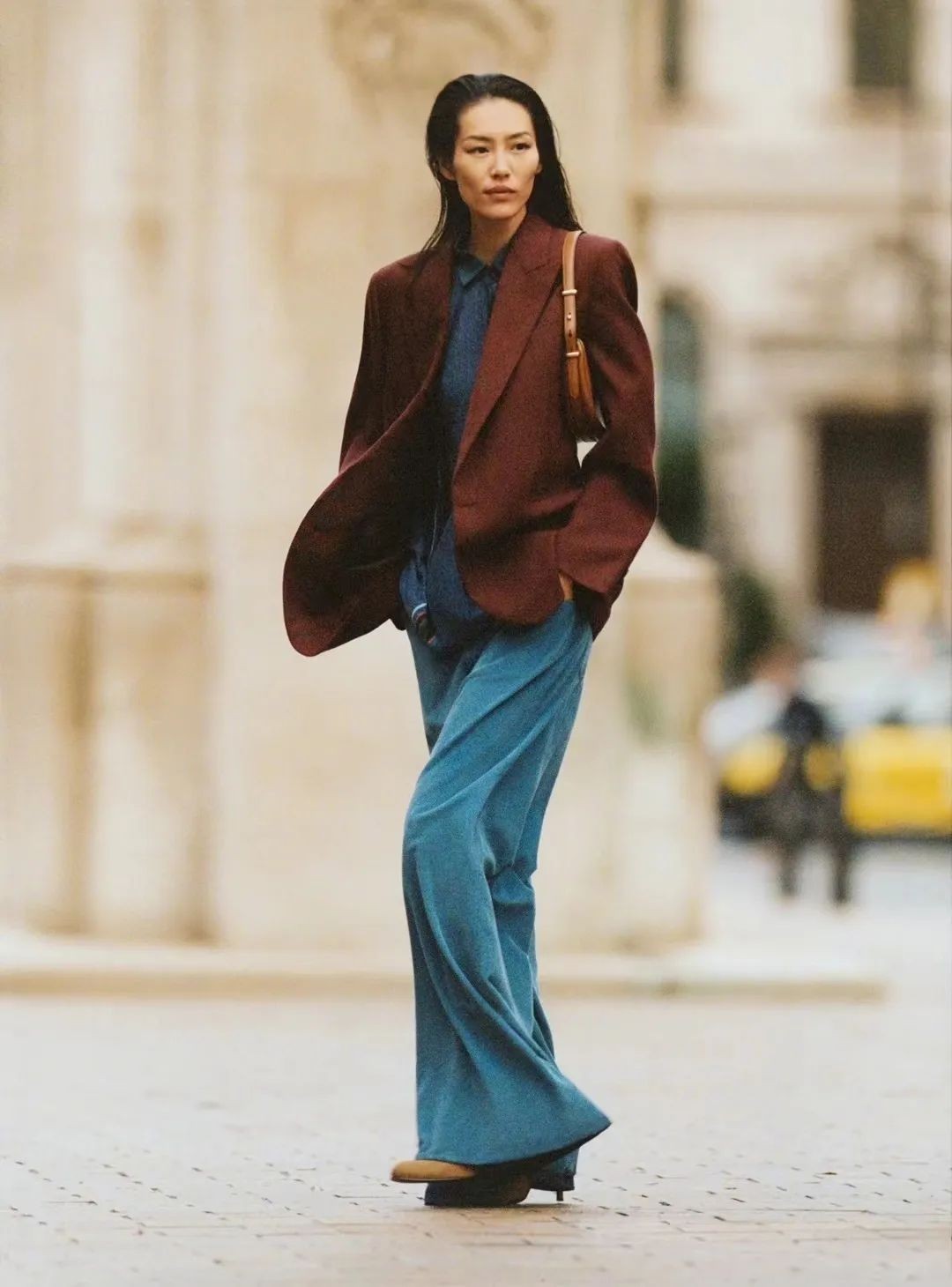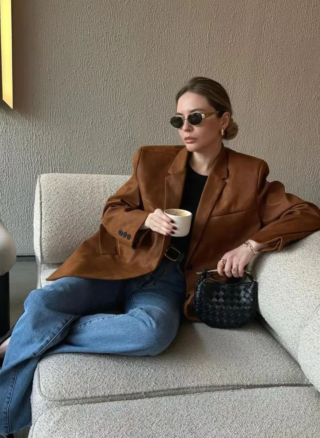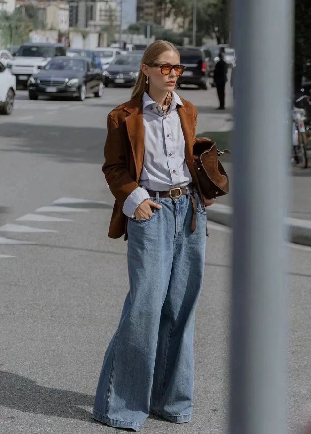 棕色西装外套或者皮夹克,也可以内搭一身不同色调的蓝色衣物,复古时髦,洋溢着丝丝暖意,很有秋冬氛围。