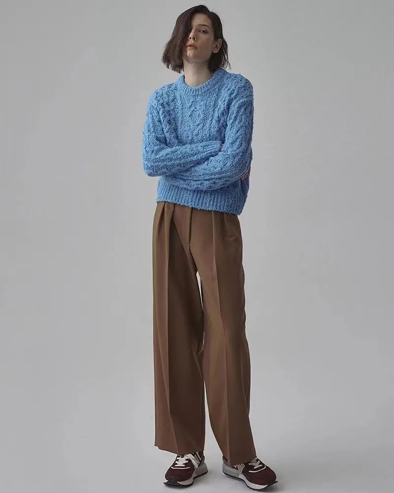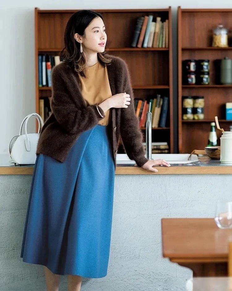 肤色偏“冷白皮”的朋友,秋冬可以放心地将蓝色系的单品穿在上半身,会将肤色映衬得更加好看。比如蓝色的针织衫搭配棕色系的半裙或裤装。