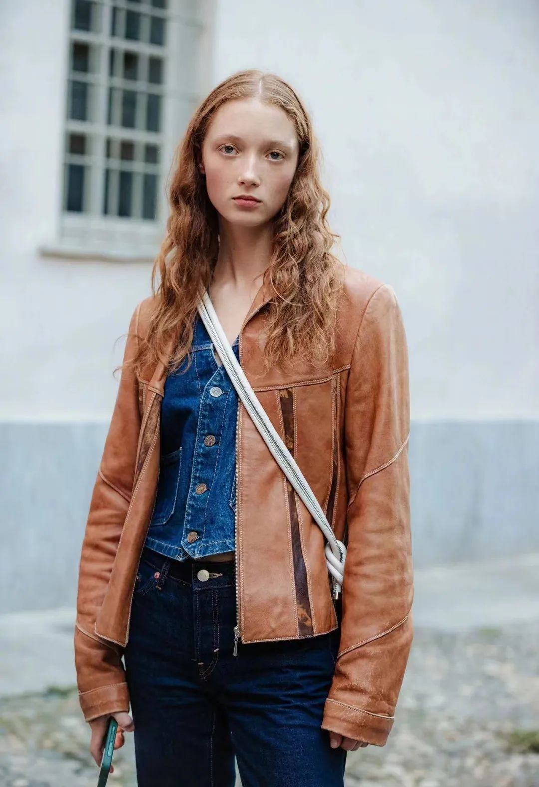 棕色系的皮衣外套,很适合用一身牛仔蓝单品来衬托,既能恰当提亮,增加造型的清新感,整体配色又不会太过张扬,而且很有复古时髦的气息。