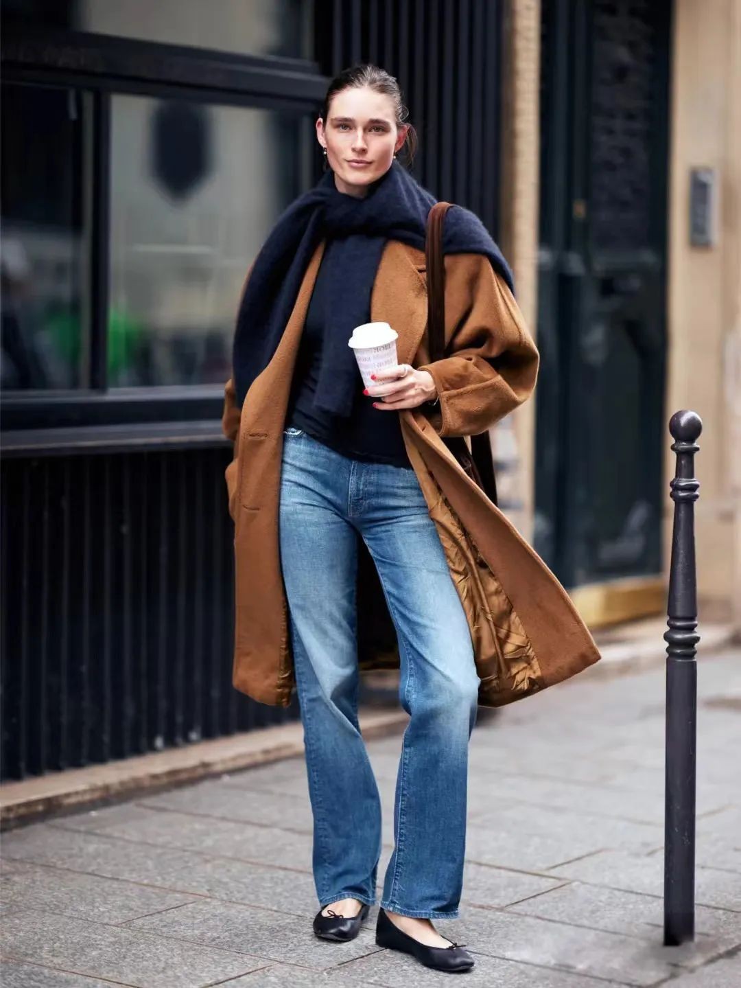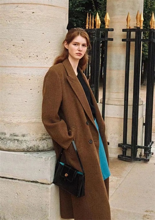 冬天经典的棕色系大衣搭配蓝色牛仔裤,是冬日里温暖又亮眼的着装。内搭可以选深蓝色或者棕色系的针织衫,协调好不同色彩之间的比例,都很好看。