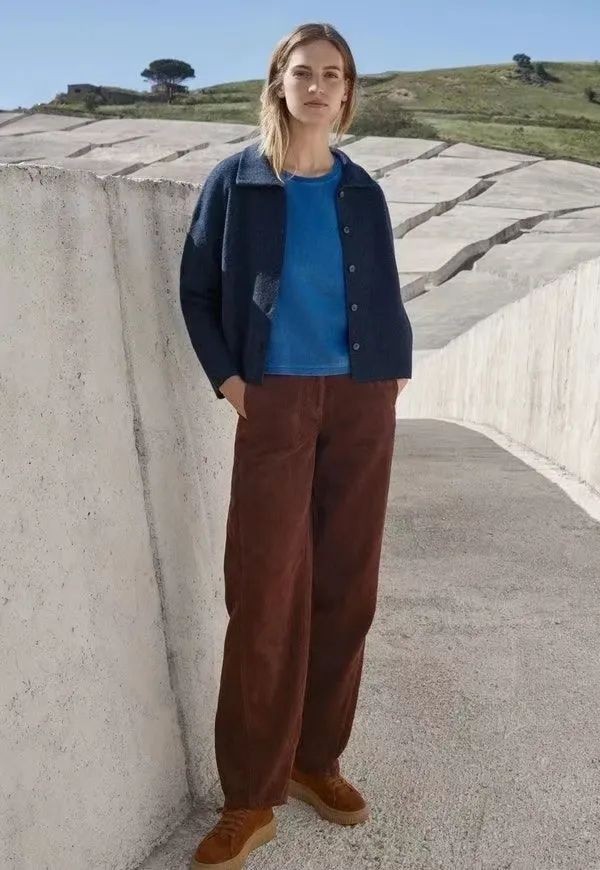 或者用两种不同色调的蓝色上衣叠穿。比如藏蓝色的外套,内搭一件天蓝色的打底衫,会更有层次感,下装搭配棕色的长裤,温暖又复古。