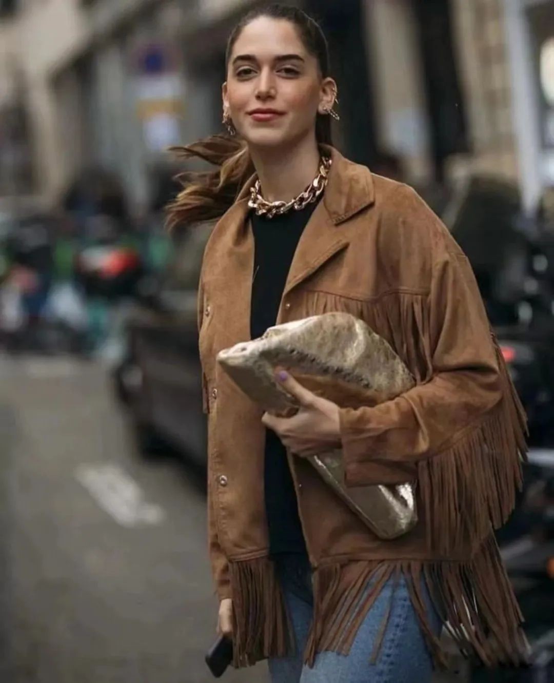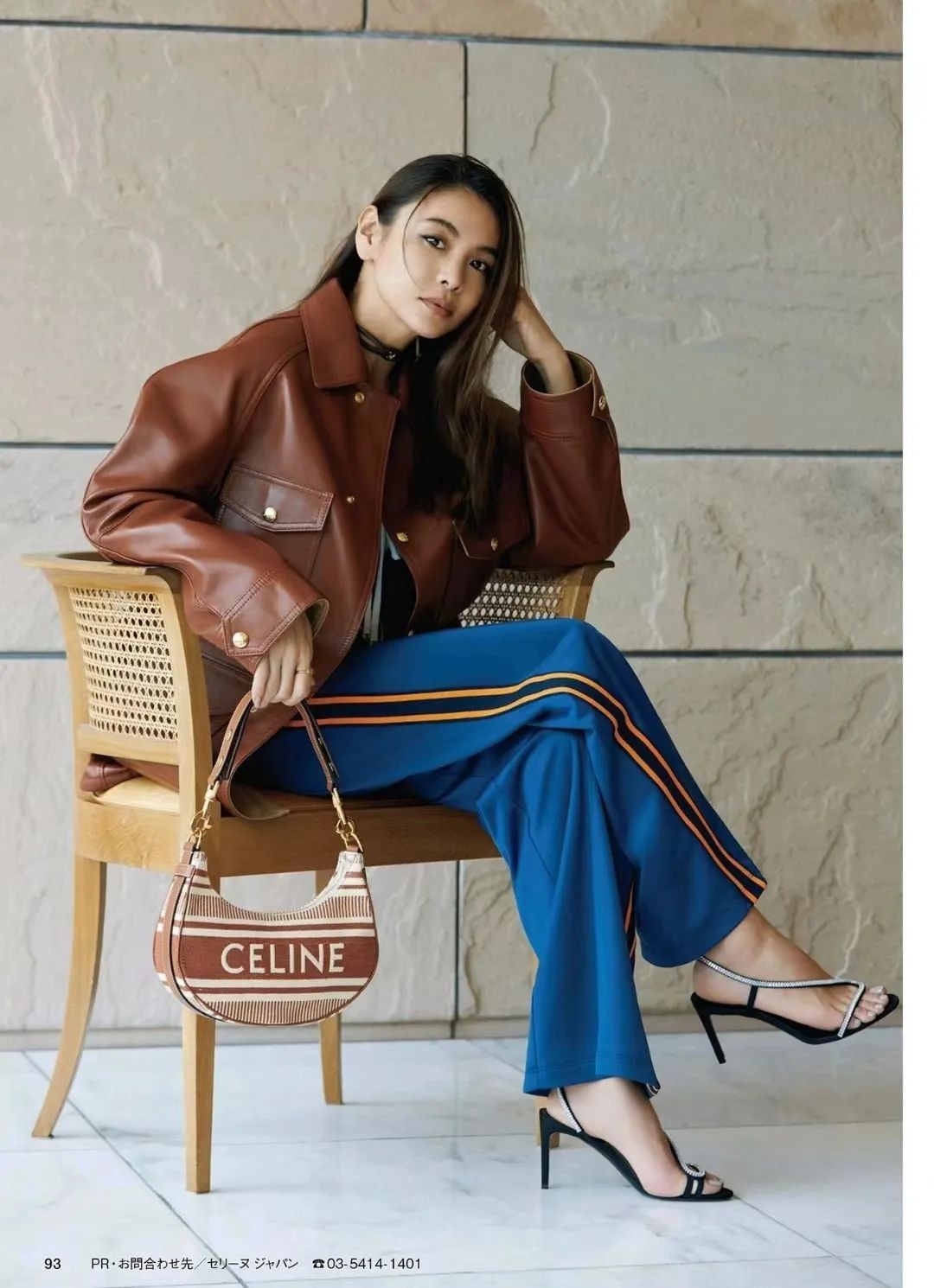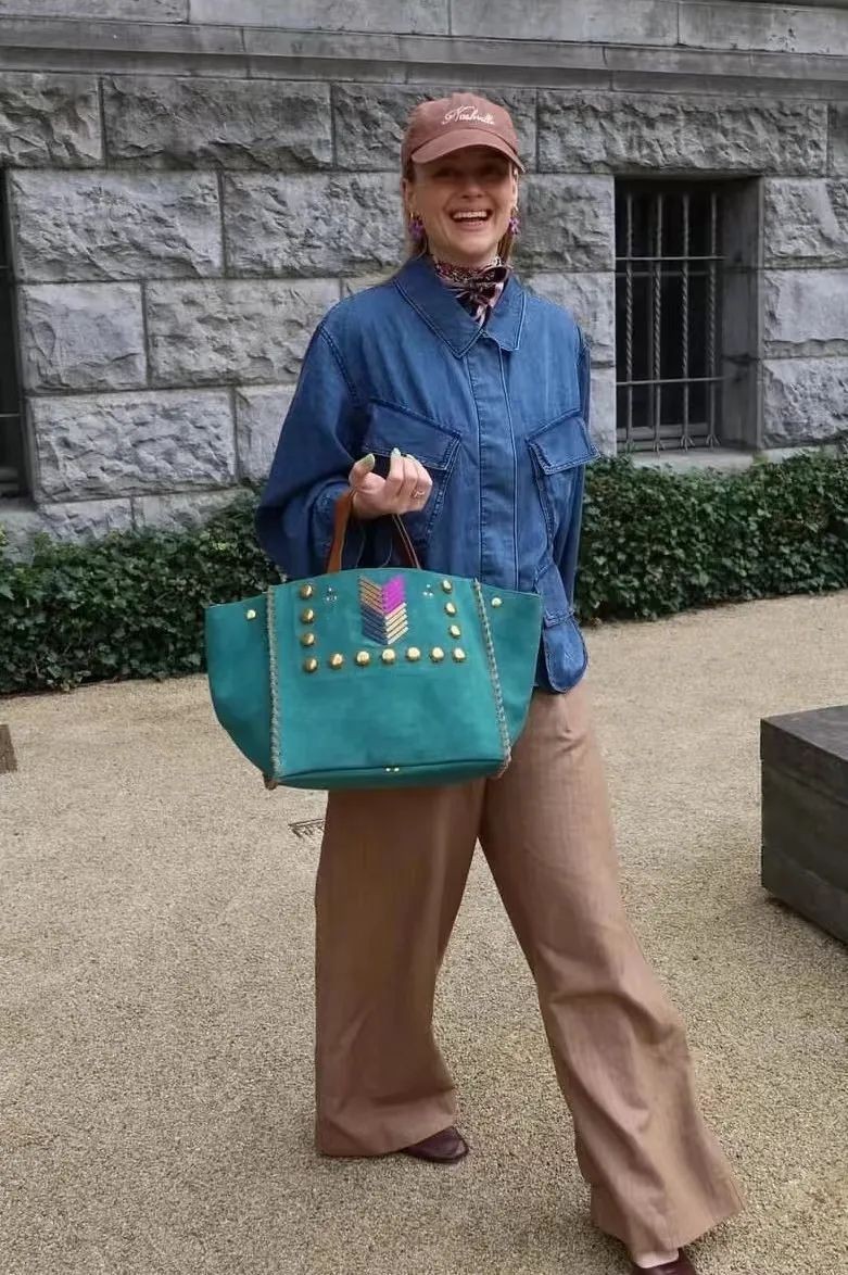 棕色复古皮衣外套搭配蓝色的“校服风”运动裤,瞬间化解老气,多了几分轻松随性,时髦又减龄。秋天还不怕冷,鞋子可以搭配纤细的高跟凉鞋,增加优雅感和女人味。