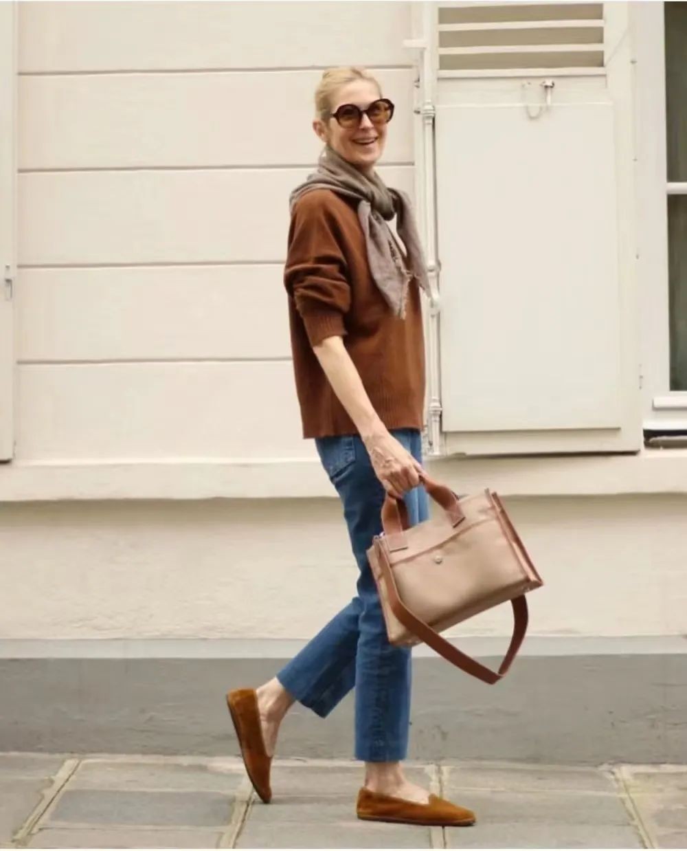 棕色系的毛衣搭配蓝色牛仔裤,以一双棕色的乐福鞋与上衣的颜色彼此呼应,会让造型更有整体感。加一条浅褐色的棉麻围巾,和上衣同色系叠搭,配色更和谐,又能营造层次感。