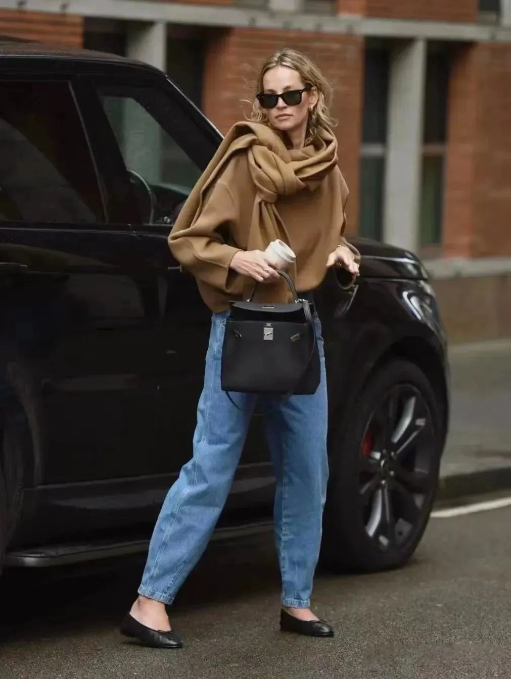 棕色单品也可以选择饱和度低一些的色调,搭配蓝色牛仔外套,整体配色看起来会更柔和一些。