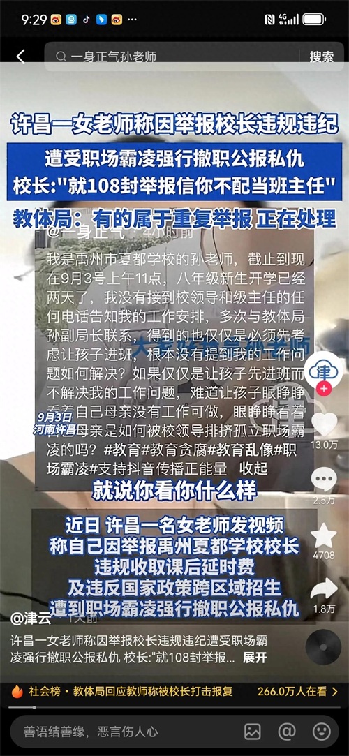 然而,她的勇敢并没有得到应有的尊重和支持。相反,她遭到了职场霸凌,被强行撤职。校长当着她的面争吵,指责她不配当班主任,仅仅因为她写了 108 封举报信。这种行为是对正义的打压,是对敢于发声者的恶意报复。女教师的遭遇让我们不禁要问,在教育领域,难道正义就如此难以伸张吗?难道敢于举报违规行为的人就要遭受这样的不公对待吗?