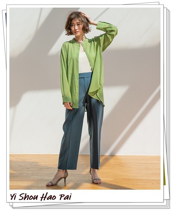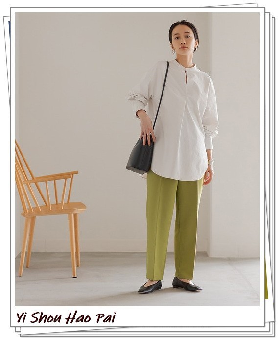 不要错过立领设计的绿色衬衫,它可以让你拥有一种别致的古典氛围。这种鲜亮的绿色衬衫和偏暗沉的绿色裤子搭配,也是一种时髦的渐变色穿搭。内搭用白色,完成清爽时尚的造型。