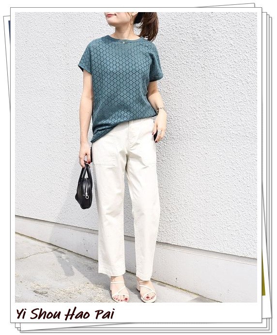 带有镂空图案设计的绿色T恤,颜色偏暗,也很适合轻熟女人。用明亮的白色裤子来提亮造型就可以了。