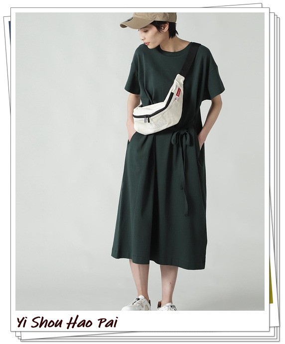 这是一种运动风格的造型。将深绿色的T恤连衣裙和运动风格的棒球帽、范妮包、小白鞋搭配在一起。腰部系带,这样会提升女人味。包包和鞋子是白色,显得干净而轻松。