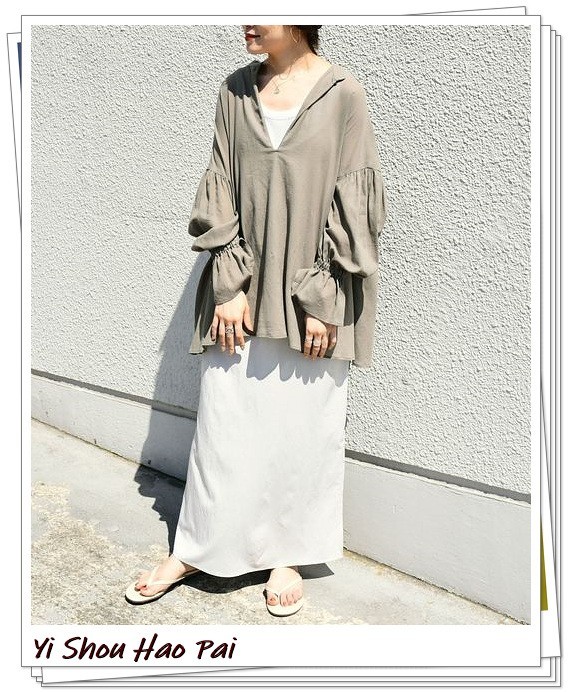 这是一件暗沉的橄榄绿色宽松上衣,袖子也很可爱,它是可以帮助你遮盖粗手臂和小肚子的好帮手。同样用白色来完成搭配就非常适合夏天。