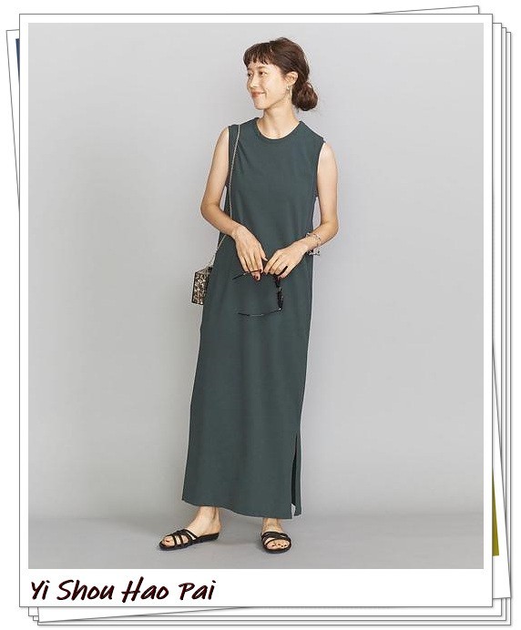 无袖的长款绿色连衣裙,裙摆侧面开叉,简单而时尚。你可以用多种配饰来丰富造型。耳环、手链、链条包、太阳镜……当你单穿连衣裙感到单调时,请尝试一下佩戴多种配饰。