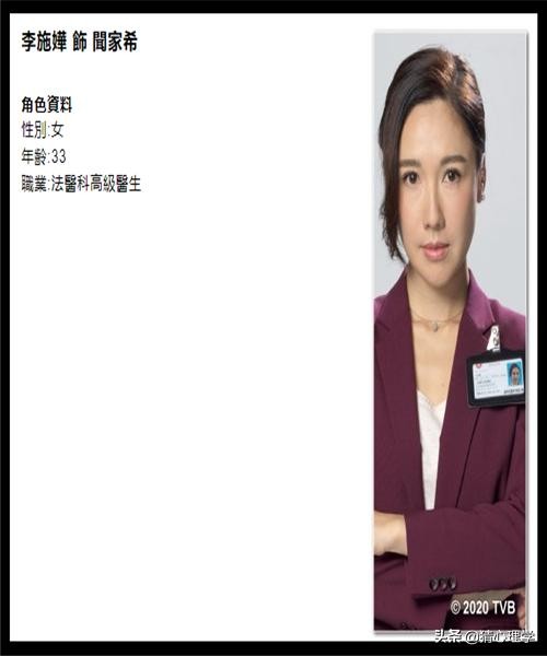 李施嬅饰演闻家希,年轻33,职业:法医科高级医生:勘察各种凶杀命案现场,适应司法实践需要或有谋杀嫌疑的尸体,判明死亡原因、时间性质,推断和认定致死致伤的凶器,分析犯罪手段和过程,维护人类生命健康与人格尊严的权利。