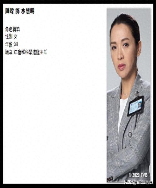 陈炜饰演水慧明,年龄38,职业:法证部科学鉴证主任:法证事务部为香港的刑事司法制度提供全面性的科学鉴证服务,其范围包括一系列专业检测工作,并就化验结果的含义作出诠释及提供专业意见,务求做到辨正、准确和有效率。