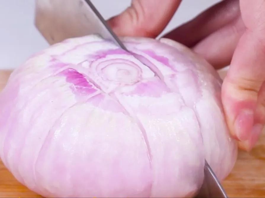 4.切花。洋葱头部和尾部用刀平切后,剥去外面的老皮,清洗干净,把洋葱竖起来,在用刀竖着切下,不要切到底,底部大约留几个厘米,转过来再竖着切一刀,先切成十字,继续重复上面的十字切法,把洋葱均匀的切成八等份。然后在花瓣上涂一些食用油,放到蒸锅或烤箱中加热一下,洋葱花瓣就绽放开了。