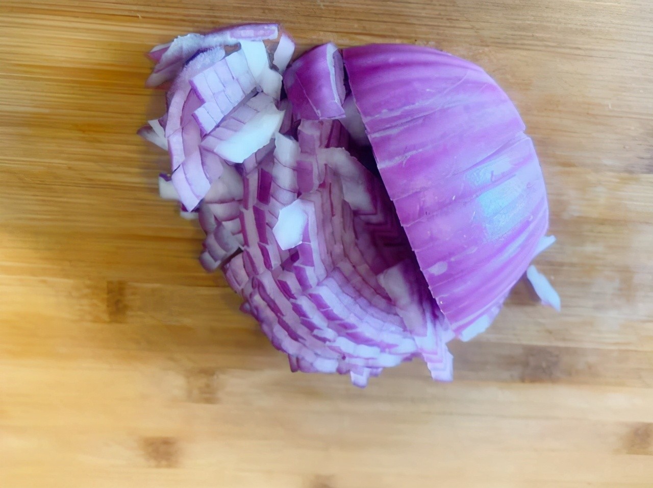 5.切丁。洋葱在切丁的时候,要清洗干净,去掉头部和尾部,从中间切开,切面朝下放在案板上,然后再顺着洋葱的纹路横切成丝,左边的一头不要切断,再用手固定住左边,竖着从上往下把丝切成小丁,最后把没有切断的洋葱也改刀切丁就行,这样切出来的洋葱丁大小均匀,特别漂亮,还不辣眼睛。大家也可以用这个方法来切末。