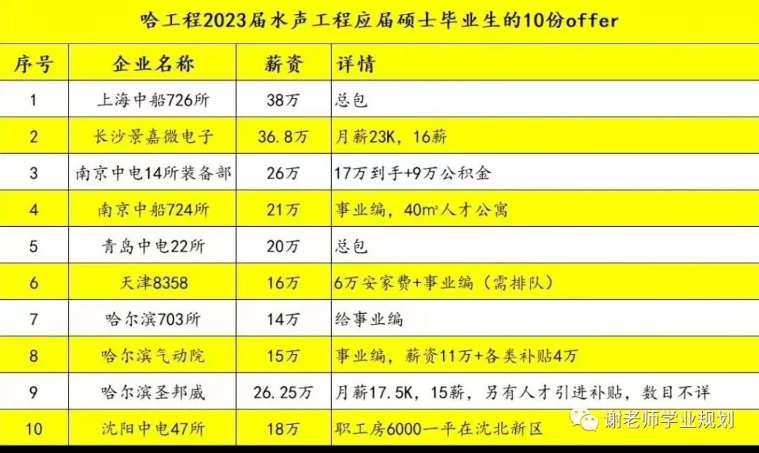 最后再来看一下这个专业的就业情况如何。水声工程专业的毕业生去向主要是水声行业和海洋、航天、航空、电子等领域的科研院所、海军技术管理部门、国内外大型通信公司、IT企业公司等。据统计,我国水声工程领域60%以上的工程师、管理和技术领军人物和科学家毕业于哈尔滨水声工程学院。当然学习水声工程专业想有好的发展,还是要继续深造。我们来看一下哈尔滨水声工程学院的一位应届毕业生拿到的Offer,可以看到水声工程的硕士毕业生,薪资待遇还是挺不错的。