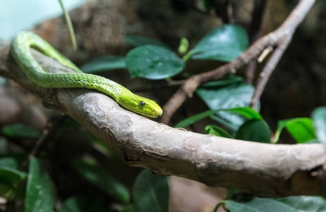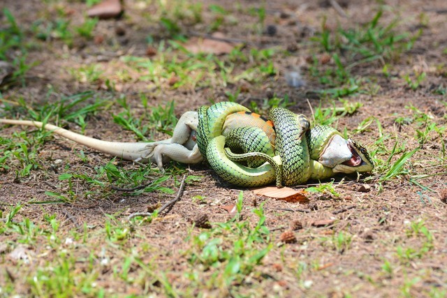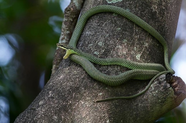 变色龙在非洲树蛇的食谱中占据了36%的份额,它通常是一种较低风险的常规猎物。尽管变色龙具备一定的防御能力,但对抗非洲树蛇这样的敌人时,它的反击能力相对有限。