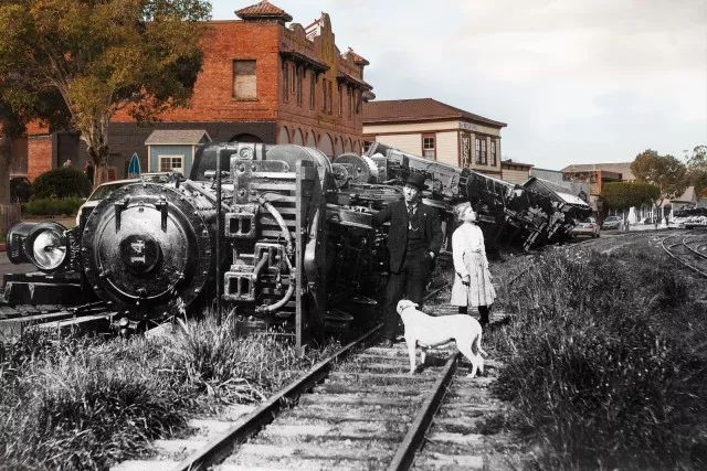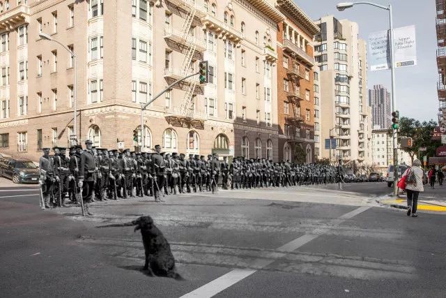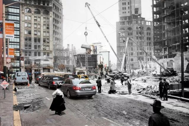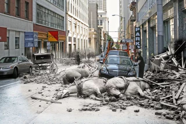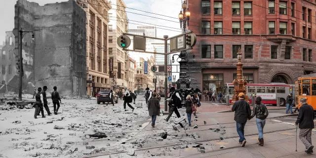 112年前震后景象与现代洛杉矶城的拼接照片,