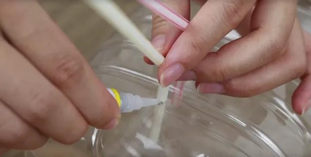 首先:我们在空油瓶的底部大概六七厘米的位置和离底部三四厘米左右的位置分别戳一个小孔,两个孔之间的距离大概两厘米左右,戳好后准备两根吸管,(为了好区分,我们分别用一根红色吸管和一根蓝色的吸管),将它们分别插到两个孔里,然后用胶水将吸管固定住,底部的这根蓝色吸管要比上面的这根红色吸管多插进去一厘米左右,用热熔胶凝固好后,再把吸管向下掰弯,再把两根吸管剪短一点,但注意上面这根红色吸管要比下面这根蓝色吸管留长一点,两根相差大概一到两厘米就可以了。
