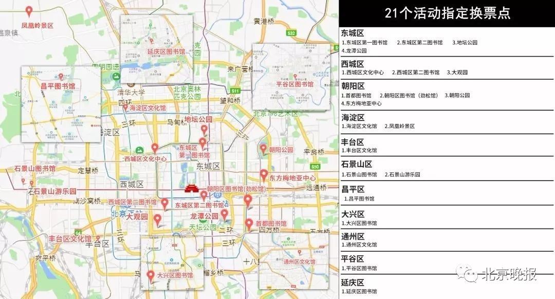 全市共设21个换票点,包括:首都图书馆、东城区第一图书馆、东城区第二图书馆、西城区文化中心、西城区第二图书馆、朝阳区图书馆(劲松馆)、东方梅地亚中心、海淀区文化馆、丰台区文化馆、石景山图书馆、通州区文化馆、昌平图书馆、大兴区图书馆、平谷区图书馆、延庆区图书馆、地坛公园、龙潭公园、大观园、朝阳公园、凤凰岭景区、石景山游乐园。