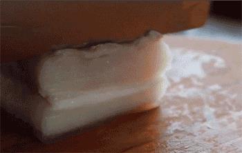 4、将肉切成5厘米长、3厘米宽、0.5厘米厚的夹层片(第一刀切到皮上,不切断,第二刀切断)。
