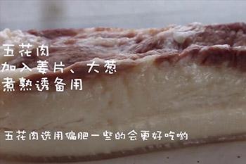 2、锅内放入五花肉、姜片和大葱一起煮熟透备用。
