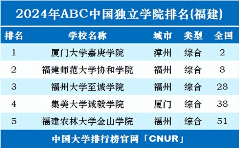 2024年ABC中国独立学院排名已正式发布,共有139所独立学院上榜,其中福建上榜5所,全部进入2024年中国独立学院百强。