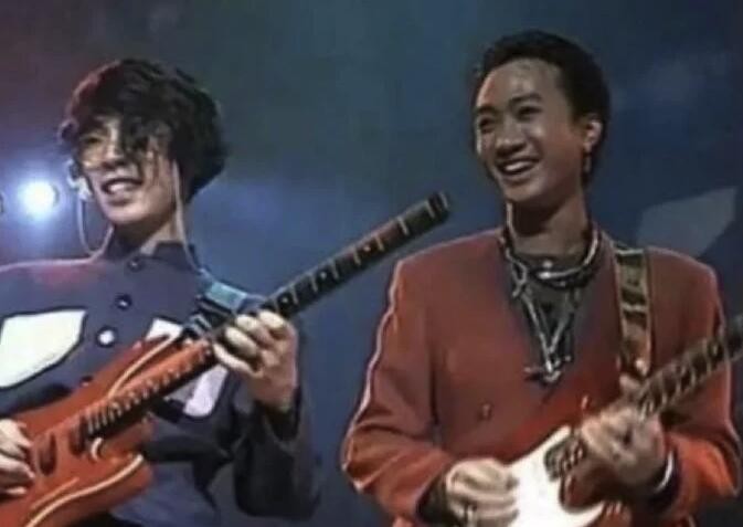 再看黄贯中晒出的两个人舞台旧照,照片中,舞台上表演的黄贯中和黄家驹打扮帅气,两个人捧着乐器脸上洋溢着灿烂的笑容,阳光又自信。