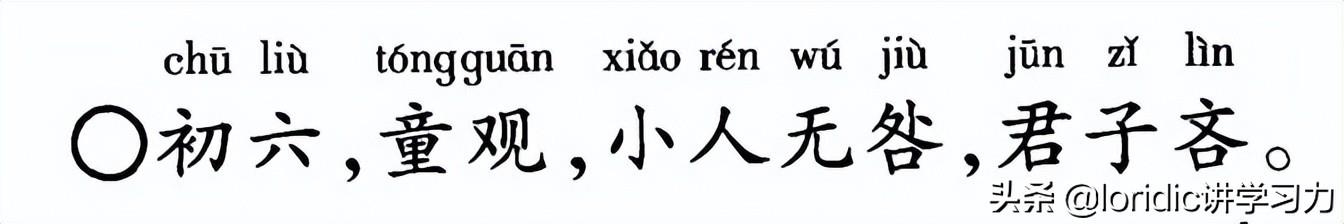 初六阴爻处刚位,不中不正又无应,而且远离九五,看不清楚,观不明白,就像儿童观察东西一样,不仔细不明白。如果是老百姓(小人)则没有灾祸。如果是君王或者大臣(君子)则会有鄙吝了。