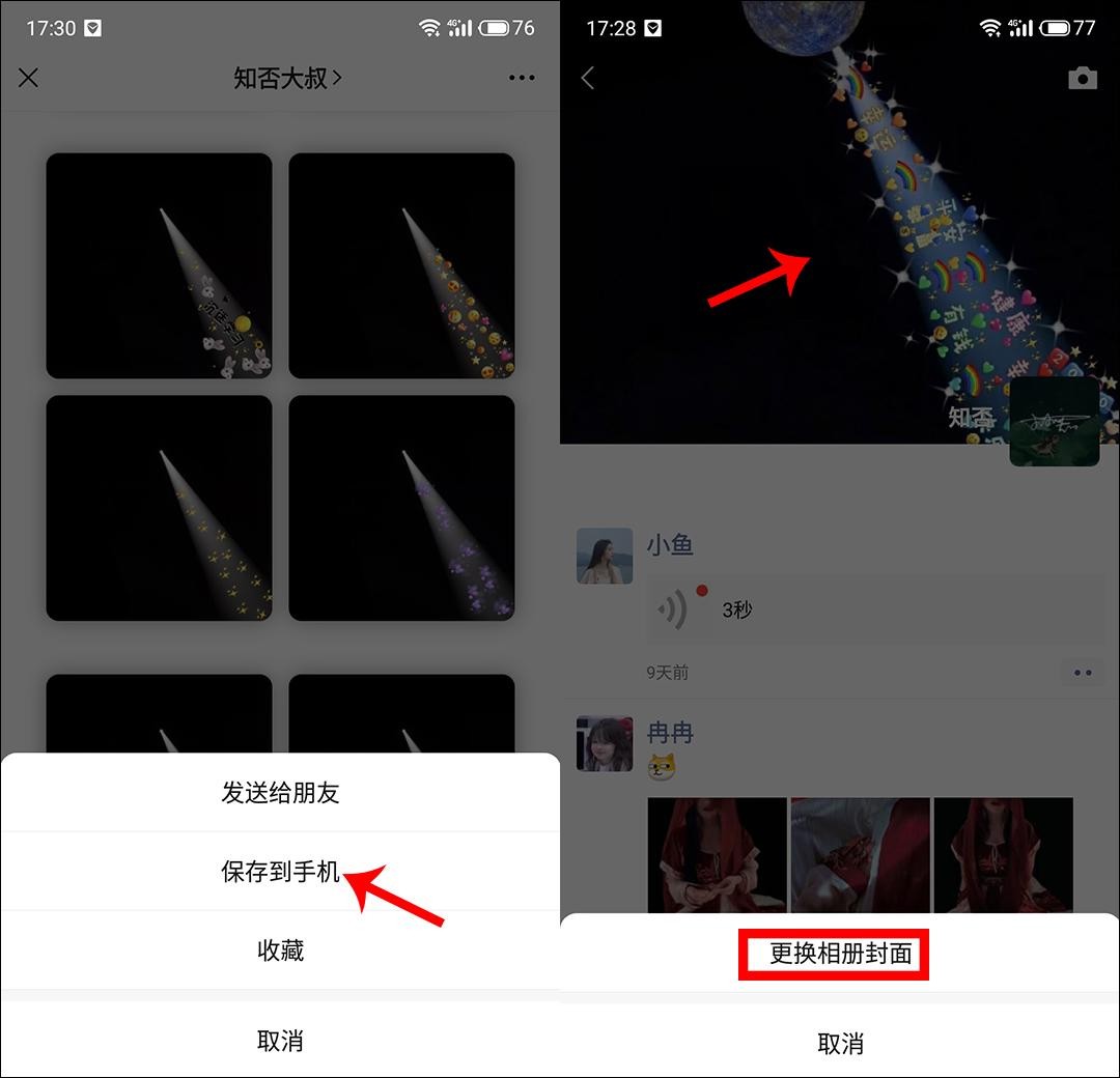 打开之后,我们只要长按图片就可以保存到手机相册了,然后打开朋友圈点击背景图片再点击“更换相册封面”就可以了。