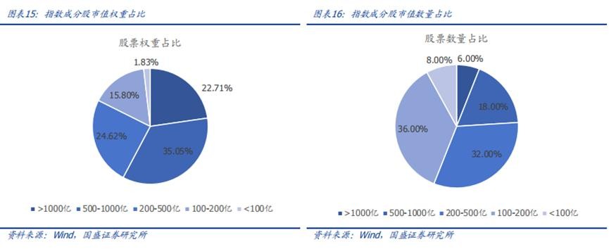 从成分股市值分布来看,指数成分股市值分布均衡。从具体成分股的市值分布来看,指数在各个市值区间均衡配置,其中市值为1000亿以上的成分股累计权重为22.71%,市值500亿到1000亿之间的成分股累计权重占比达35.05%,市值200亿到500亿之间的成分股累计权重占比达24.62%,总市值在200亿以下的成分股累计权重占比为17.62%。因此整体而言,指数在大、中、小市值风格上均衡配置,市值分布较均衡。