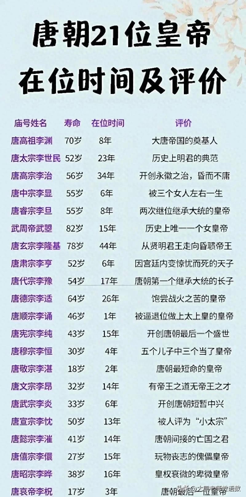 今天,就让我们通过一张表格,来了解唐朝21位皇帝的在位时间以及后人对他们的评价。