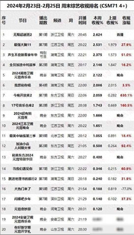 近日,上一周电视综艺收视率排行榜揭晓。尽管已是新年假期最后一个周末,收视率总体保持稳定。此外,适逢元宵节,多家电台同时举办春晚,竞争亦十分激烈。成功突破1%收视率的节目有四档,突破2%的更是有七档。以下为您呈现前五名的盛况: