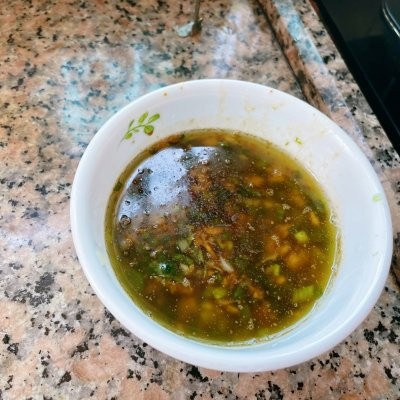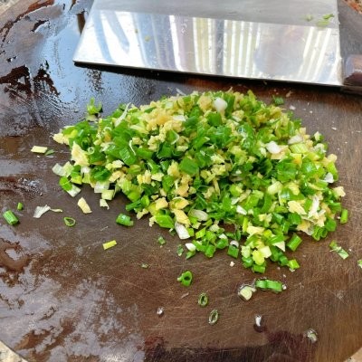 4、蒸鸡的时间,准备调料碗,这是白切鸡味道的精华!姜蒜切碎,葱和香菜切小小段,备用