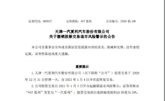 公告显示,公司股票于12月31日停牌一天,1月4日开市起恢复交易,并撤销退市风险警示。证券简称由“*ST夏利”变更为“一汽夏利”,证券代码“000927”保持不变,日涨跌幅限制由5%变更为10%。