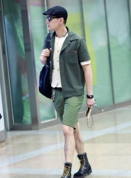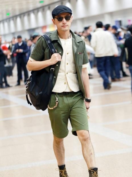 夏天到了短裤和短袖是不能少的,胡歌选取的颜色也很大胆,是一身绿色的穿着,上面有着白色的短袖映衬,所以不会显得很单调,同时上面外套的颜色与短裤的颜色又有点不同,给人视觉上的区分。