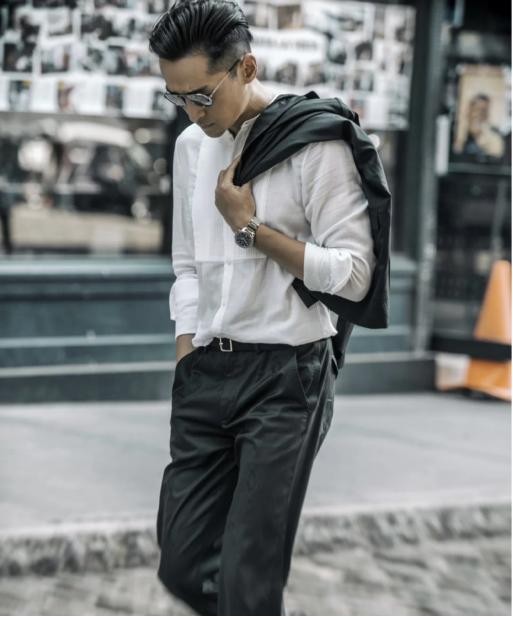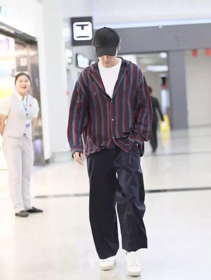 宽松的版型在老胡好身材的映衬下也不会显得很胖,同时内里的白色内搭外加红色的条纹点缀,很有时尚感,同时宽松的裤子以及小白鞋,怎么穿都是潮男一枚了。