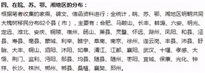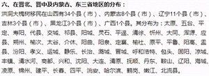 根据《明史》、《明实录》、《日知录之余》等正史及笔记史料的记载,洪洞大槐树移民分布在30个省市,2217个县市。其中河南123个县市,北京、天津、河北142个县市,山东109个县市,山西104个县市,江苏、安徽、湖北、湖南316个县市,陕西、甘肃、宁夏182个县市,黑龙江、吉林、辽宁171个县市,浙江、福建、江西227个县市,广东、广西、贵州248个县市,四川、内蒙古、青海274个县市,云南、西藏、新疆210个县市,海南、台湾111个县市。