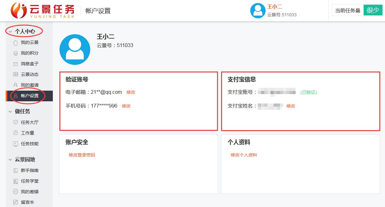 1、用户在网站填写的支付宝是获取云景任务酬劳的渠道。请在“个人中心”的“支付信息”里填写自己的支付宝账号和对应的姓名。