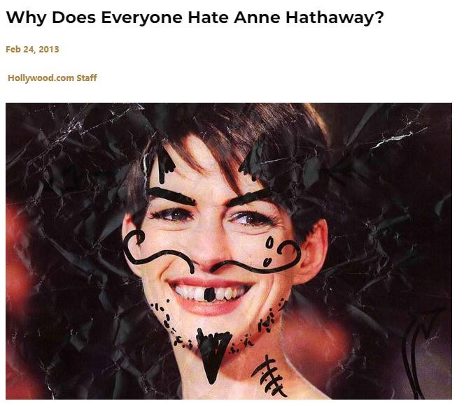加之各大权威媒体推波助澜,“反海瑟薇”一度成为某种时尚热潮。而一切的起因,居然是她太完美了。