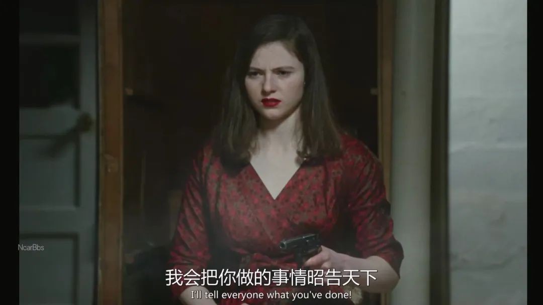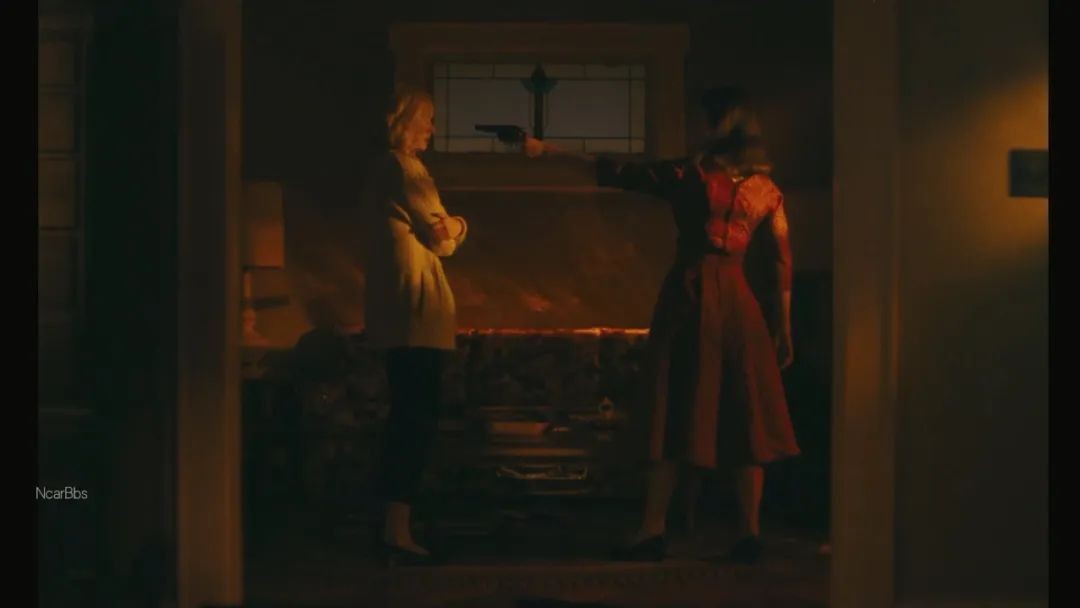 最终,在女人坦诚,她的确发现丈夫的行迹,却因耽于丈夫在侵犯过儿子后,对自己展露的歉疚与爱意,因此帮助隐瞒时,艾琳终于忍耐不住,开枪射向波尔克夫人。