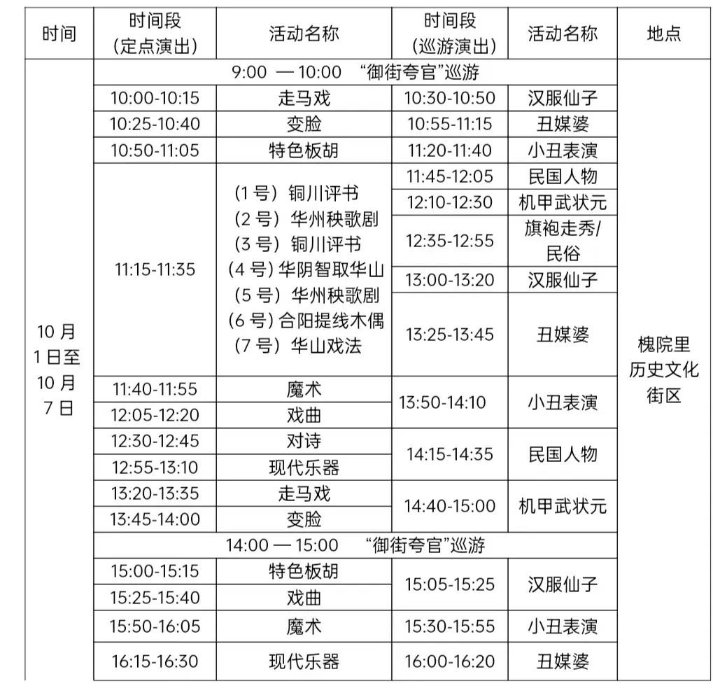 活动内容:“御街夸官”沉浸式演艺、特色板胡、走马戏、变脸、戏曲、魔术、小丑、汉服仙子、民国人物、机甲武状元等民俗活动。