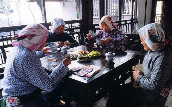 周庄人吃茶历史悠久,历来有吃“阿婆茶”、“讲茶”,喝“喜茶”、“春茶”、“满月茶”等习俗,名目繁多,被称为江南水乡的“茶道”。