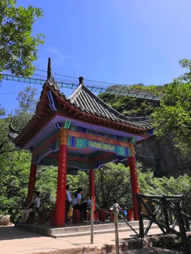 桥头也有玻璃桥售票点和游客休憩凉棚处,标识5D玻璃天桥!这里分叉口可以走下山,也可以继续往上。